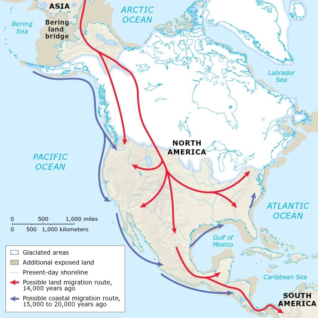 이들이 이동할 수 있었던 배경에는 당시의 지리적 환경이 있었다. 마지막 빙하기 무렵, 바닷물의 수위는 지금보다 훨씬 낮았고, 오늘날의 캐나다와 미국 북부 대부분은 빙하로 덮여 있었다. 현재 아시아와 북아메리카를 가르는 베링 해협은 그 당시에는 육지로 연결되어 있었으므로, 시베리아에 살던 사람들은 매머드와 같은 대형 사냥감을 쫓아 신대륙으로 들어올 수 있었다. 이러한 작은 집단들의 이동은 바닷물 상승으로 베링 육교가 잠겨 사라질 때까지 수천 년에 걸쳐 계속되었다.
