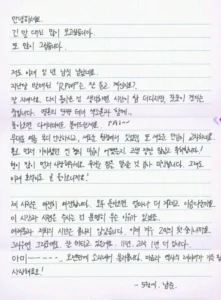 *(As we all know, RM is a poet. However, in this impromptu handwritten letter, he wants to immediately convey to ARMY that he misses them deeply, choosing to forgo any verbal flourish—긴 (ghin) (long) 말 (mahl) (words) 대신 (sin) (rather than). This Korean expression is typically used to get straight to the point and can sometimes come off as brusque, so people usually avoid it. Yet, in this context, it is clear that RM is not being rude. Instead, he wishes to underscore his profound yearning for ARMY by starting the letter with this expression.)